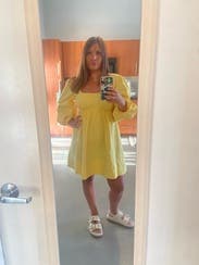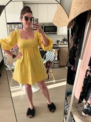 Rented this for vacation, wore twice more once I got home. Compliments galore! The yellow really pops and makes a simple silhouette a real statement piece. My only lament is I wish it had pockets, but it's otherwise easy, breezy and the sleeves are ever so poofy.