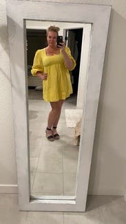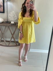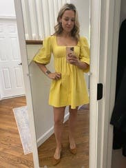 the butter yellow is so eye catching in person and the babydoll fit is very flattering. short dress so went with larger backup size since i’m tall, smaller was too short