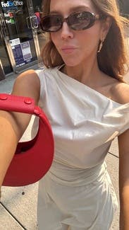 The purse is not quite true red. More of an orange red IMO. it’s pretty small—like my iPhone 16 doesn’t really fit. I carried a lipgloss, and ID, and credit card and like a car key. But it really did look cute with so many outfits. Would rent again.