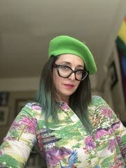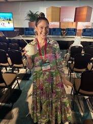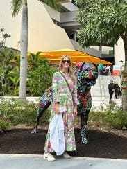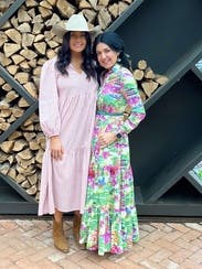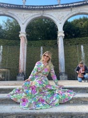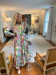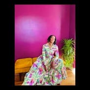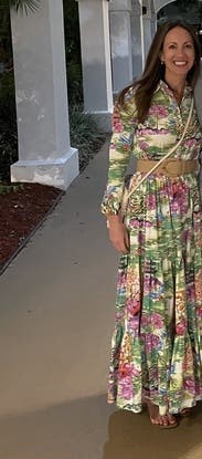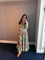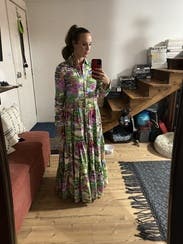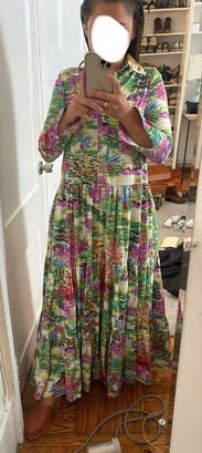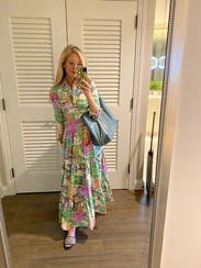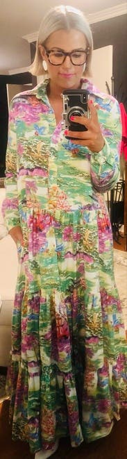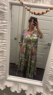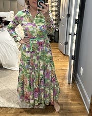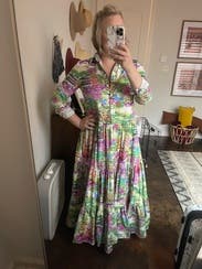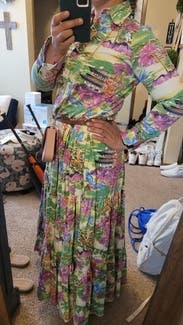 I wore this to a spring brunch back home in Oklahoma. It had a great western vibe due to the broomstick style skirt and the fitted western style button up top. The pattern is tropical but you don’t notice! It was quite wide in the waist, I had to belt it. It is VERY thick and heavy on bottom. It took up a ton of space in my suitcase due to all the fabric in the skirt. It runs long- dusted the floor for me in flats. Once I found a belt and the right shoes, it was a showstopper! Lots of compliments. Beautiful colors- I loved the neon lavender!