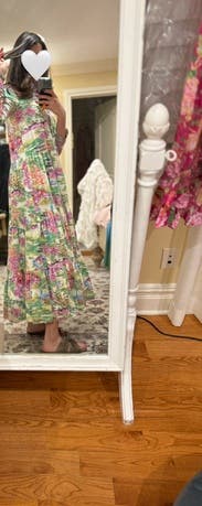 This dress is absolutely stunning! So many compliments. This does run a bit roomy as I was able to wear my normal size during second trimester of pregnancy.