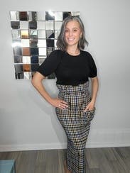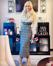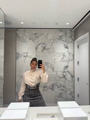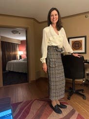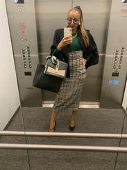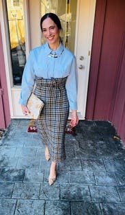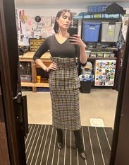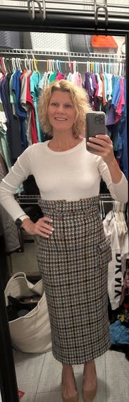 The cut of this skirt is truly unique, extending lower (t length) and higher (just below bra line) than the usual pencil. Also loving the color palette in the houndstooth! Wish I could keep.