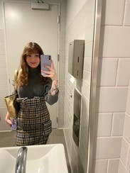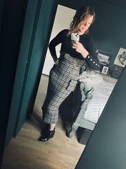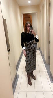 I loved this skirt, even if no one else did. Best for pear shapes! For all my ladies with a tush, RTR recommended a 40, and 42 fit great! I’m 131, 5’3”, and have a somewhat small waist - this was great. It was lined, so it wasn’t itchy, and I managed to snag this right at that first fall freeze in illinois so it was very cozy for that cold walk from your car to your desk (if any of you still go into office). It is tapered toward the bottom and really elongates the leg with even a little heel, however I did sort of have to spin to get in and out of any deep chairs, haha. Loved the skirt!