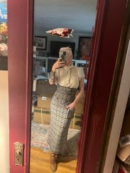 Gorgeous shape, so flattering, a throwback style that really matches the houndstooth pattern. Very warm, kept me warm at an early winter event. A woman crossed the room to compliment me! I wore a black turtlenecked cashmere sweater, and the only accessories were earrings, as the skirt and waistline are the main draw. I wore pantyhose and after 30 minutes wished I'd also worn a slip as the wool was itchy. I lasted four hours of standing/sitting, then couldn't take it any more. Would rent again for a fall/winter event.