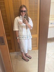 Oversized and easy shirt with fun embroidery details. Does get wrinkled but didn’t mind so much. Think it adds to the carefreeness of the shirt.