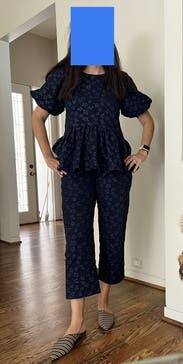 Rented both the top and matching bottoms, and loved how it turned out. In the pants I took a med and those fit true to size (prob could of done the small as well, but the waist is elastic so felt comfy in the med!). I'm normally either a small or med, 4 or 6. Wore to a wedding dress rehearsal dinner and felt put together, and chic. Got loads of compliments!
