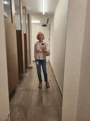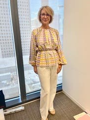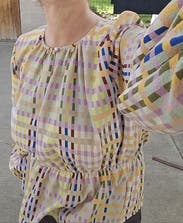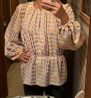 Afer wearing it once and catching glimpses in the mirror all day, I fell in love. It's such a fabulous plaid print with unusual colors. Very high quality. I have a large chest (about a 36DD in these photos) wearing a size 10 in most things and the Large was a bit too big. I think I could've sized down. The shoulders are lovely. I wore it with jeans and with a skirt and also experimented with mixing prints. The colors perfectly complement the purple/cream plaid & floral on the No. 6 Agatha jeans also rented from RTR. (2nd photo shows the jeans- currently only visible for me in browser desktop view, not on Android mobile web or in the App on an iPad). I'm a Stine Goya fan now and can't wait to try other items from this designer.