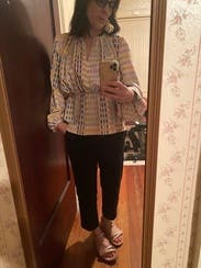 This is an interesting blouse, I am just not sure that I really loved it. I wore it to a public event and felt polished. Runs a little big.
