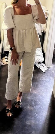 I had to really prepare to wear this one. The shoulders wouldn’t stay up so I used double sided fashion tape. Bra straps show so needed a strapless. Loved this as a set with the matching pants. Also, I wore with gold strappy sandals because my white shoes were too white but my cream shoes were too cream. Worth the effort though! Got so many compliments, even by my friends’ husbands who wouldn’t normally notice.