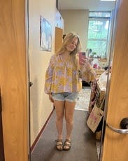Love this top. I wish I wasn't on vacation with it, because my closet was limited so I really just didn't have anything to wear with it. It's definitely a harder piece to style because there is so much material on it. It would be cute with like light yellow fitted pants or shorts.