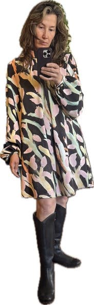 I (woman in my 50s) this to an evening event where my kid was giving a speech. Several people — including young men — commented on the dress. It’s playful, 80s and new at the same time. I wore it to work earlier in the day with leggings. I wish I could purchase this but it’s so eye catching it couldn’t be a wardrobe staple.