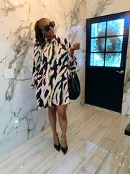 This was a bit baggy so I styled with a belt. I absolutely loved the pattern on this dress as well as the fabric!