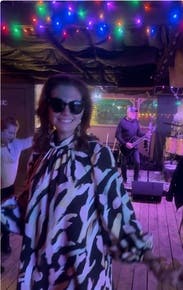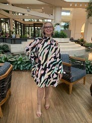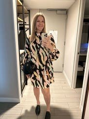 A little big but belted and wore to a rehearsal dinner. Fun print
