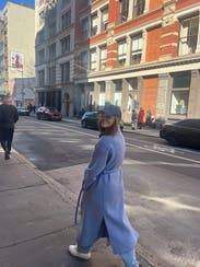 Wore this jacket multiple times. Perfect heavy fabric for the unpredictable springtime weather. The blue is lovely and pulled together so many various shoes/boots/hat looks. It runs big bc it is. That's the current style and I love it,!
