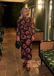 This dress is very flattering and easy to wear. It’s a brown background with pink carnations. I wore it to see Stranger Things on Broadway. I love Suboo’s designs!