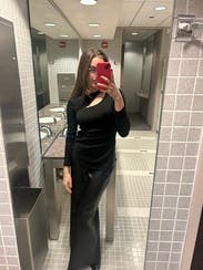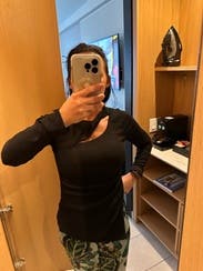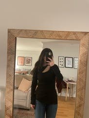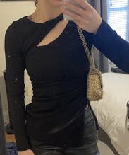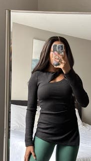 It's a pretty basic long sleeve black top but the cutout and the slit on one side make it elevated and chic. I like the ruching because it hides a full/bloated tummy well! It fits quite snug but it stretches and fits well once on.
