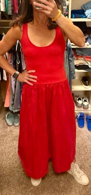 Red knit bodice and woven skirt (Bodice: 80% Viscose, 20% Nylon; Skirt: 100% Rayon; Lining: 100% Cotton). Casual Dress. Scoop Neck. Sleeveless. Pull on. Shoulder to hemline length: 50.5". Imported.