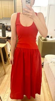 The Suboo Naples Drop Waist Midi Dress features a fitted red bodice and full skirt with a drop waist. The contrasting textures and midi length give it a laid-back polish.