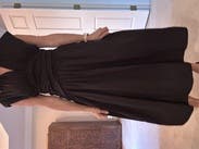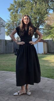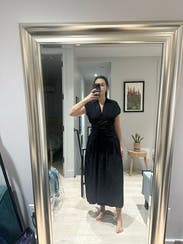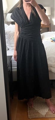 Beautiful cut with a lovely wrap detail and a gorgeous collared top. The dress has great movement and works well for an event or even for work. It does run tighter through the center than expected, especially under the stomach, so consider sizing up if you prefer a less fitted feel. A polished staple black dress overall.
