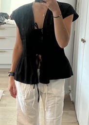 it’s a really cute top. Great silhouette. The ties are a little bit annoying but does has have an inside flap to cover any areas that may be revealed between the ties. It just takes a lot of adjusting. I read the other reviews, but I feel like this top pretty much runs true to size unless you’re a little larger in the chest then I would suggest sizing up.
