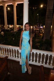 Summi Summi’s Valentina Dress turns heads with its vibrant abstract print and sleek, floor-length silhouette. Pair it with platform sandals and bold earrings for a standout summer evening look.