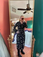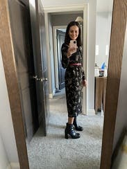 Honestly, this dress looked a little pentacostal on me. Even my husband was like, um...not sure about that. I did just have foot surgery, so I am stuck wearing flat, wide, comfy slip on shoes, which I have in a nice black pair, but I do think it would have looked drastically better with heels. Overall the length is a little off, like it needed to be just a couple of inches shorter on me (I'm 5/7"). But I still wore a couple of times - once with hose, once without.