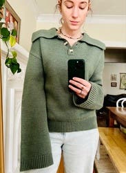 So simple, yet the huge collar and long sleeves make this sweater feel unique and special. Lovely color and fit. I'm almost never bothered by wool or other sweater materials, yet this one was just a touch scratchy to me-- which means that more sensitive folks will probably find it quite itchy. A thin fitted turtleneck would look great under this though.