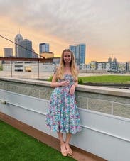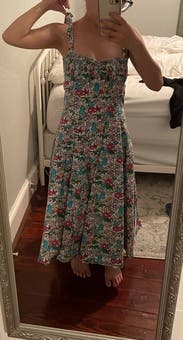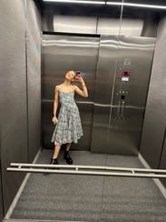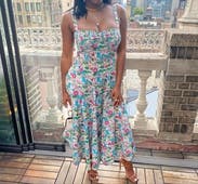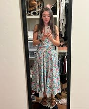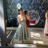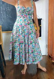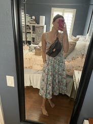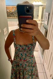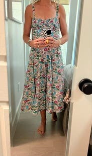 Love the print & length & ruched bustier top & adjustable straps were a tiny bit too long but made it work! It has POCKETS and a bit of a drop waist which seemed funky but looked adorable on! Added a gold belt for some shape and got tons of compliments!