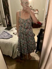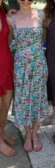 this dress was so cute and comfortable! i really really liked it. the only reasons why i didn’t give it 5 stars were because the straps keep slipping and because it bunches up in a weird way in the back. i didn’t mind it but maybe i would’ve considered buying the dress if it didn’t have that problem. overall it was very flattering, comfortable and versatile.