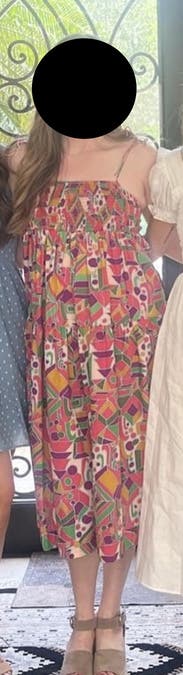 Pattern is so bold and fun. There is a lot of skirt, which is why I took an XS. Straps are able to be tied shorter/longer. I’m 5’10 and it hit me like right below the knee.