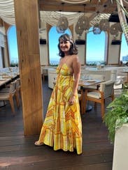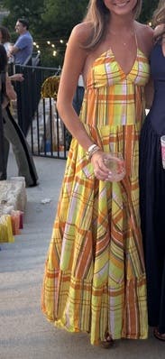 A bold yellow and orange plaid gives this elegant tiered maxi by S/W/F a retro feel.