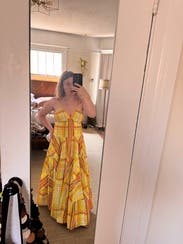 Such a cute, flattering fit and fun to wear! The fabric is beautiful and will need ironing…. The straps are thin and need to be tied tight around your neck (if that’s how you decide to tie) and can pull a bit because of the weight of the dress. Otherwise perfect!! Awesome rental!