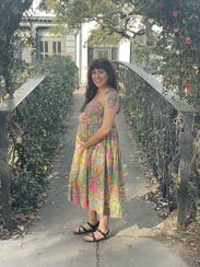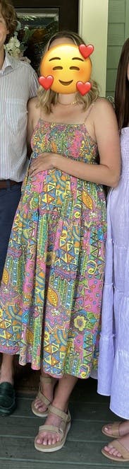 Loved this dress for vacation at 24 weeks pregnant. Lots of fabric as others mentioned but it works! Can dress up or down. I found that the straps didn’t stay super secure but it wasn’t terribly burdensome. Just had to tie a knot before a bow so they’d stay put.
