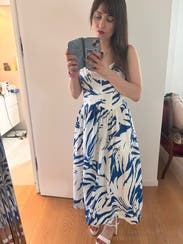 This dress is SO flattering, I considered buying it and wish they had it in solid colors! I have wide hips and a large chest and it can be so hard to find flattering dresses with current styles. Also didn’t need a bra!