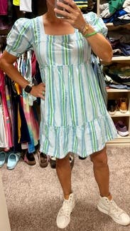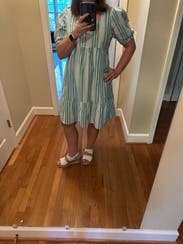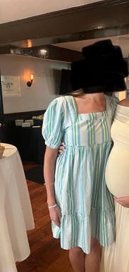 Easy breezy cotton dress. Wore 6mo pregnant so bump friendly as it’s not super short and first hem fits just under the bust. Wore this for casual weekend days, even work.