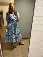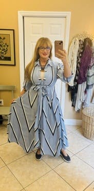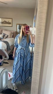 This was super cute for weekend activities, and even remote working (can’t see the back on a Zoom)! Only comments are the buttons are tight in the chest for those with big busts, it’s long (almost hitting the ground, and I’m tall!), and the tie is super weird and hard to figure out.