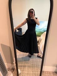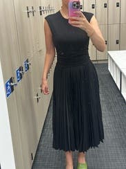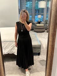 Super soft and comfortable. Love the fitted top with side ruching. Super flattering. Fun long flowing pleated skirt. Although a tad bit long for my 5’2” frame I still loved. Lots of compliments on this one!