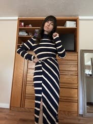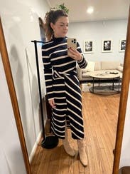 Was hoping to wear this for a speaking engagement, but the stripe pattern and twist waist wasn’t that flattering. Also, the slit was too high for a professional setting, but I’m tall with long legs so maybe it felt higher on me than for others.