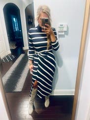 I tend to stray away from stripes, but felt this had enough asymmetry to be ok. Glad I did! This dress is beyond comfortable. I would suggest sizing down…XS would have fit me better, but that isn’t stopping me from loving it! The side slit and gathering at the waist took it over the top.