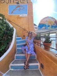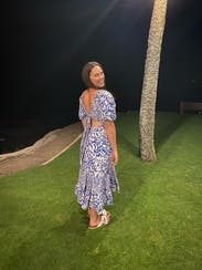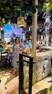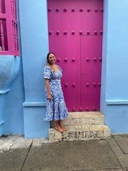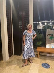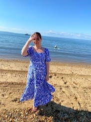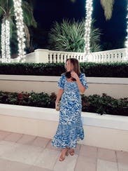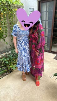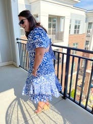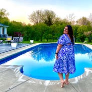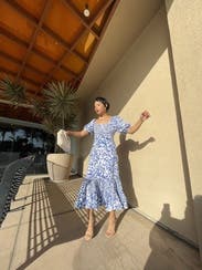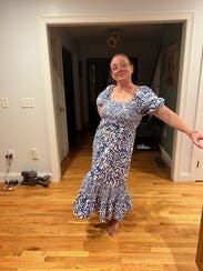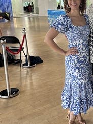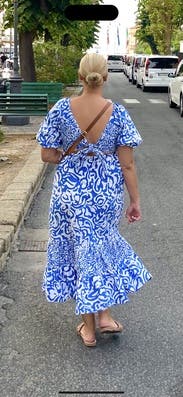 Weird pic but only one I have of full dress. Wore on vacation. Super comfy, great print. Was able to tie the back around my strapless bra to make it tighter. Would size down unless large chest. Would rent again!