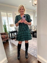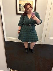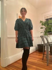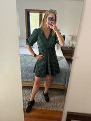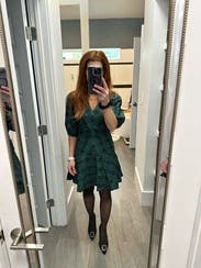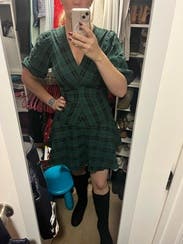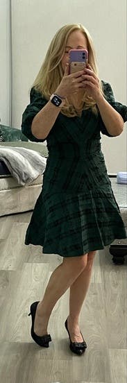 I wore this for a dinner date and to a small holiday party. It was great for both occasions! The fabric is a soft cotton plaid- I was worried it would read to casual but it didn't. I wore it with black Ferragamo flats for dinner and navy heels for the party- it worked well dressing up and down! It looked SO SMALL on the hanger- the shape is deceptive. It hugs perfectly at the waist then flares out. The sleeves are slightly ballooned. It was a good length for me but I am short. Overall loved it!