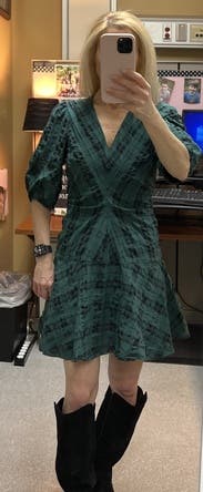 Love the way this fits, like a fit and flare. The sleeves are puffy but it was fine for the holidays. I sized up and I’m so glad I did!
