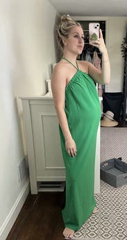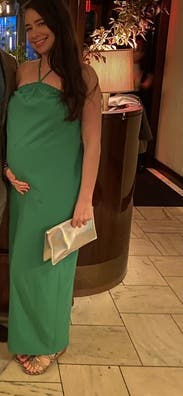 The open back is so pretty but can’t wear a bra. Beautiful material. Feels high end. Actually worked for maternity which is a mega plus!