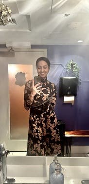 I rented this dress for the holidays and because I struggle to pick “out of my comfort zone/not my typical style” pieces. I got about 10 compliments on this dress when I went home for the holidays! Fit is TTS (I’m usually a M/6). It was warm, but not overtly so (I get warm easily, and I was fine with being indoors.) The fabric is substantial (not too thick, and not thin) and dress is very well made. The material is soft and comfortable. I wore this probably 3 times in a month, and each time received several compliments. Bonus points: it does not wrinkle easily at all so is great to pack.
