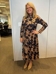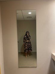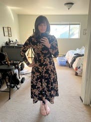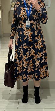 I rented the same dress in a different color — Love the fit and thickness of the dress (warm). I thought the color would be brighter based on the photos but it was drab and so more for fall/winter than spring. If the colors were brighter, I would’ve bought this!