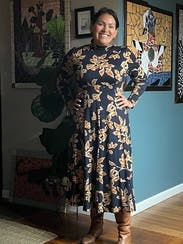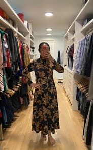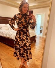 Style this moody floral midi by Tanya Taylor with your favorite knee-high boots to take this fun frock from work to weekend. Finish your look with gold jewelry to embrace an autumnal vibe.
