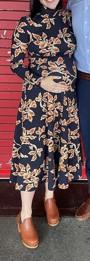 I loved this fit for fall! Wore the M from 30-32 weeks pregnant at ~160 lbs. The fabric is thick and feels expensive. It smoothed me out so nicely despite lots of new baby belly lumps. Unique pattern, felt very chic. Color is a dark navy, not black.