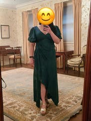 This dress is beautiful! I had ordered 14R initially, but it was too large. The 12R was a perfect fit! The slit & drape of the dress was really fun, especially on a windy day. The side button/ruching was a cute detail that also made it forgiving for a buffet brunch. The asymmetrical hem was a tad long at the longest length, but wearing heels solved that issue. And you should definitely plan to wear cute shoes with this dress! The side zip made it easy to wear, and there are some bra strap buttons to prevent the sleeves from sliding off, but you could choose to wear it off-shoulder if you wanted to, I ended up adding some fashion tape just in case to cover my bra, but it wasn't necessary.