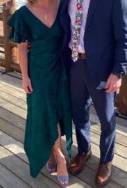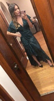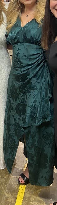 Wore this for a St. Patrick's Day gala and it was perfect. Beautiful emerald green fabric, you can't see the floral pattern that well in the photo but it looks great in person. It was a little tight since I'm in between sizes but it worked for a whole night of food and dancing. I'm short but paired with these gold 3" heels it was the perfect length.