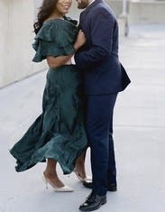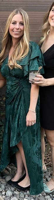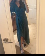 I wore this to a formal wedding and received SO many compliments on this dress...the color is divine, the length is extremely flattering even on my shorter frame, and the fabric looks and feels so luxe. You NEED body tape to keep the shoulders in place if you are petite, so be sure to stock up upon renting this gorgeous gown.
